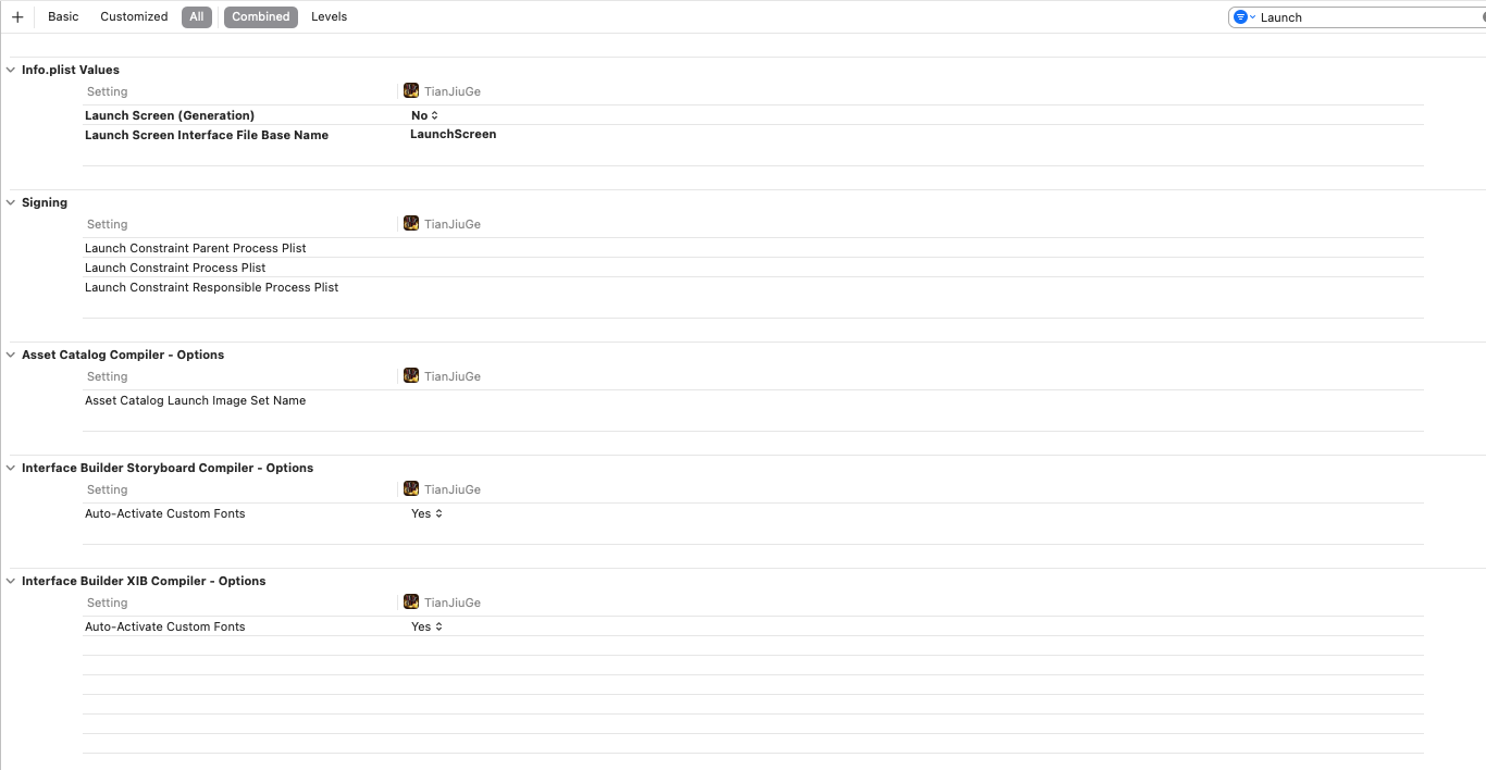 4. 搜索Build Settings中LaunchImage相关信息删除,并设置如下即可
